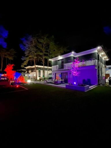 W ogrodzie zastosowaliśmy kolorowe oświetlenie DMX, pozwalające tworzyć wyjątkowy klimat na zewnątrz budynku. Od nastrojowych wieczorów po dynamiczne aranżacje świetlne na spotkania towarzyskie. Wewnątrz domu wdrożyliśmy kompleksowe sterowanie oświetleniem, które pozwala dopasować nastrój w każdej strefie do pory dnia i potrzeb domowników.